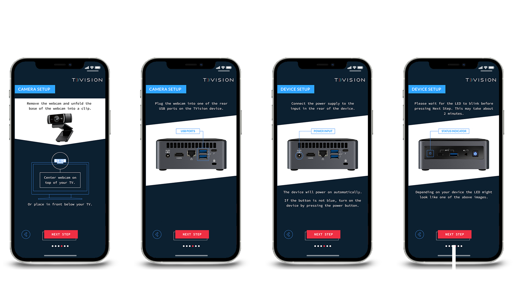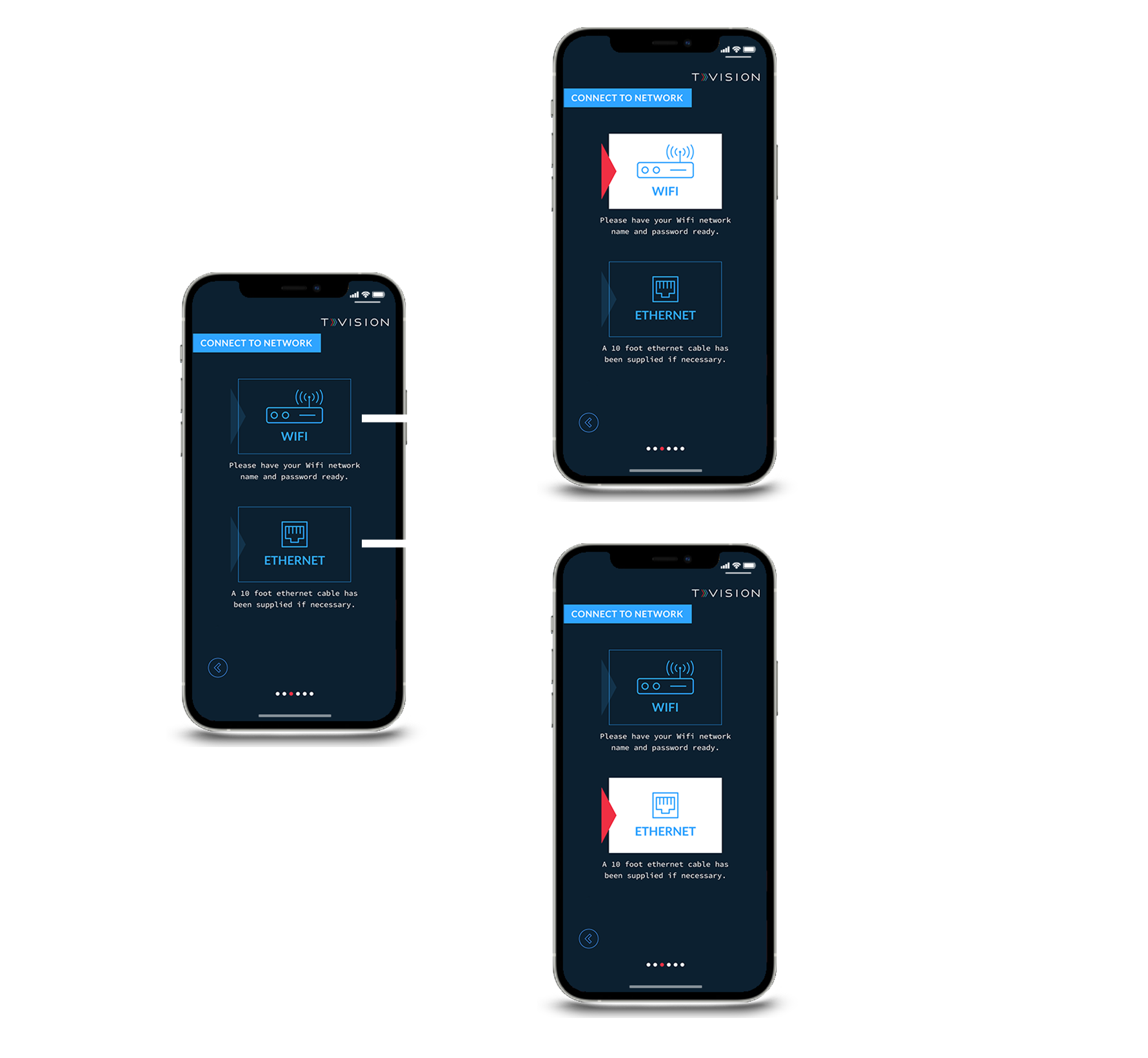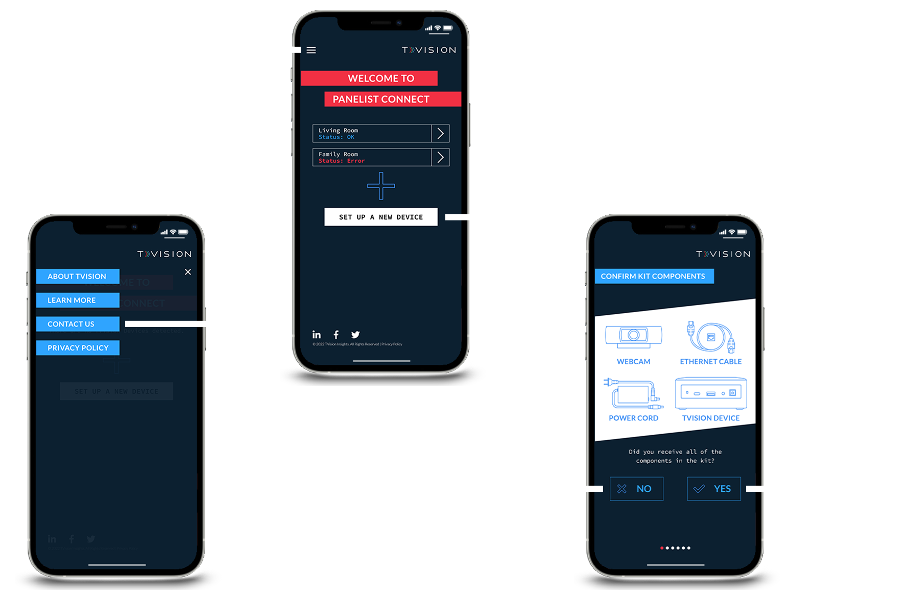 App map and wire framing for TVision Panelist Setup Wizard skins showing progression through the hardware installation process.