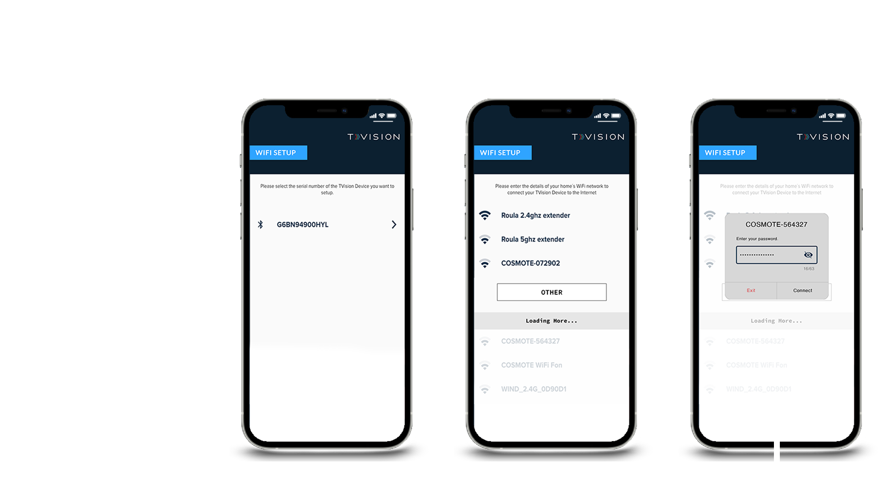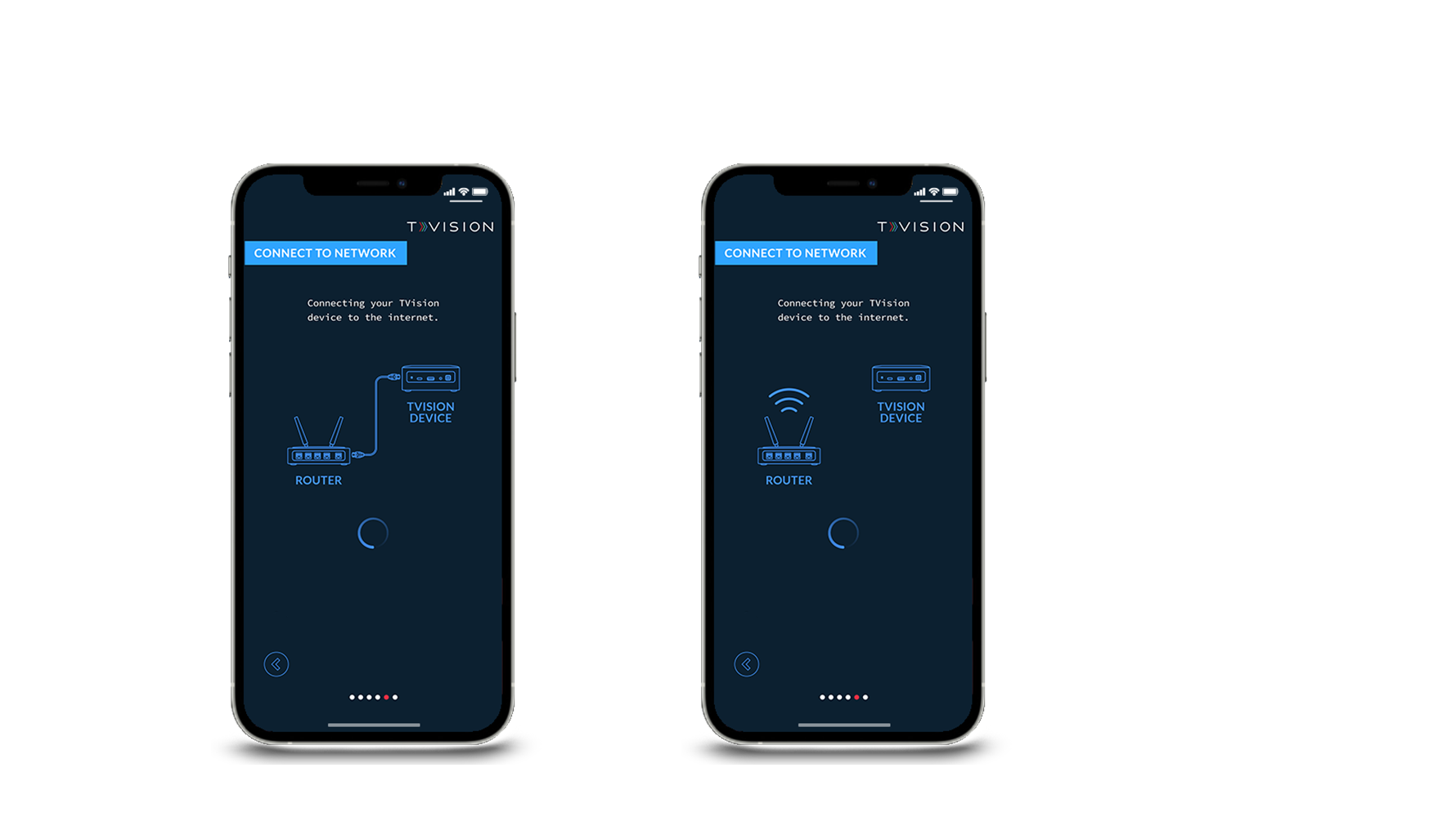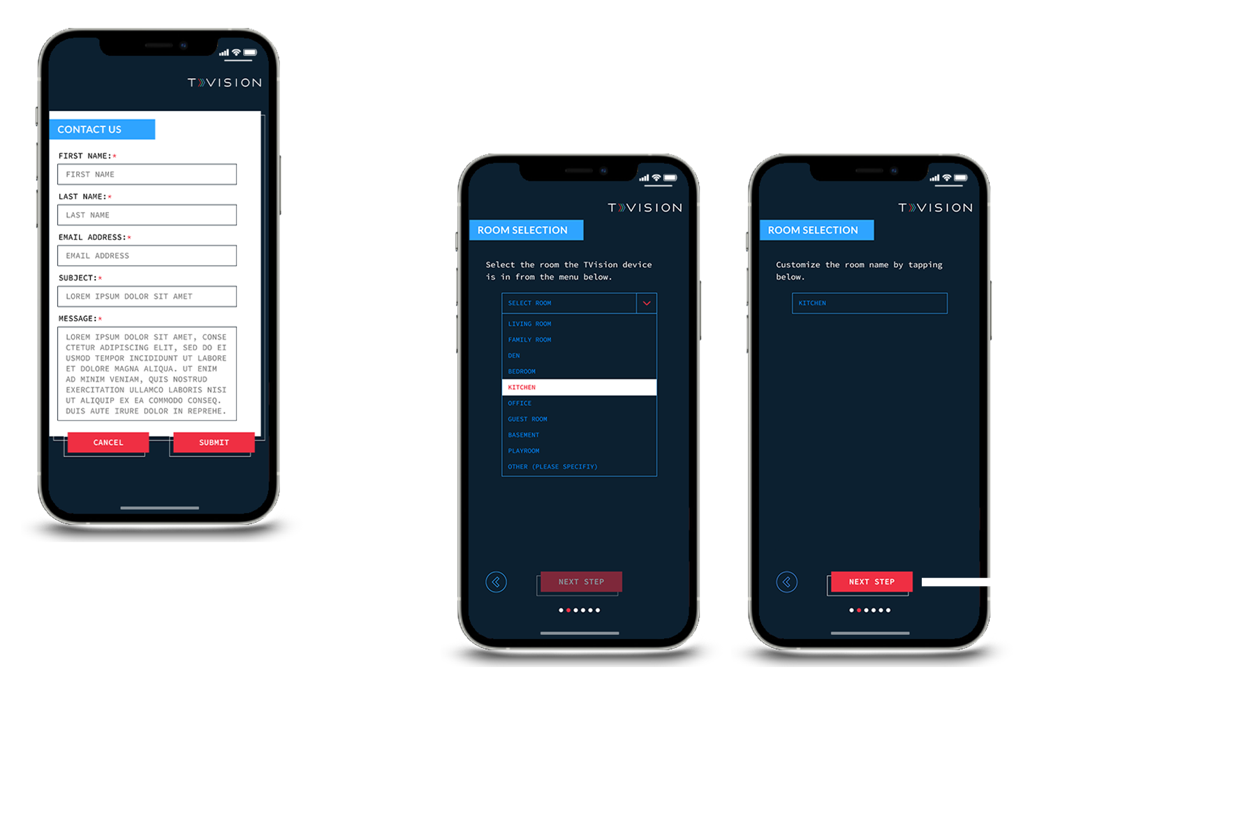App map and wire framing for TVision Panelist Setup Wizard skins showing progression through the hardware installation process.